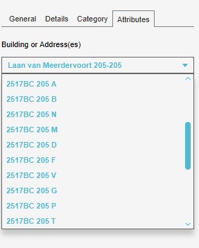 Attributes of Addresses can be accessed through the Attributes overview of their related Building, where a dropdown allows for a switch between displaying the Attributes of the Building itself, or the Attributes of a specific Address.