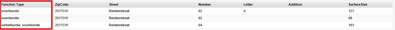 The function of the Address is a string of text, with differing functions for the same address separated by comma's. Note that the descriptions of the function of Addresses are distinctly different from the Tygron Platform's built-in Functions of Building. The text describing the function of an Address is based directly on the BAG's records and is text only, whereas a Building's Function is a separate datatype with multiple properties of its own.