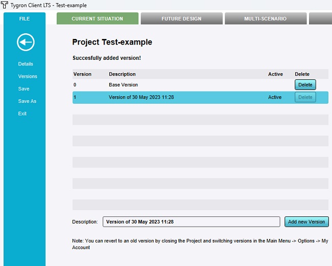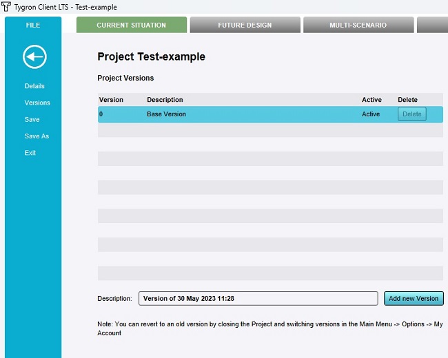 If changes are now made to the Project and the Project is saved, those changed will be stored in the new version. At any point in the future, it will be possible to revert the Project back to the initial "Base Version", which will not include those changes made in the second version.