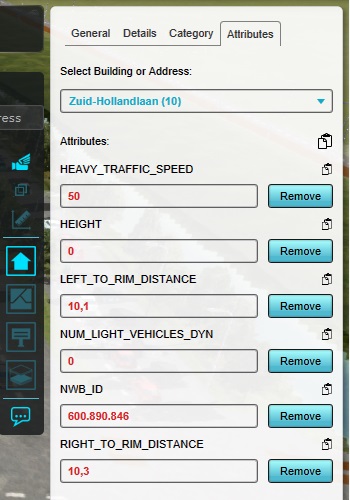 Lastly, there is the Attributes tab. This tab displays Attributes, which are effectively miscellaneous properties the data has. In the case of a roads Building in a Project in the Netherlands, for example, an NWB_ID Attribute may be added to the Building, which is a national standard identification for roads allowing them to be easily related back to external datasources.