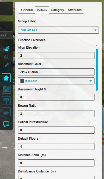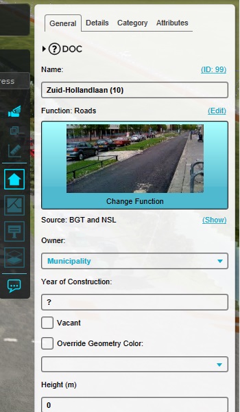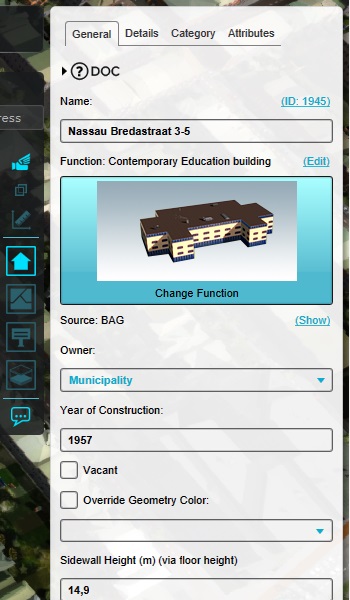 Buildings also have properties divided into a Details tab and a Category tab. These tabs display a range of additional values for this Building, which in the case of Buildings are derived from their building type (In the Tygron Platform known as a Function).