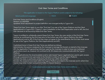 If the Tygron Platform has not been run recently on this computer, a prompt may appear for the end-user license agreement. If you agree with the terms, accept it. Note that accepting the EULA is required to continue this tutorial and to use the Tygron Platform in general.