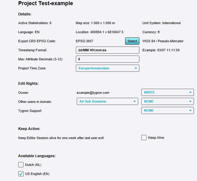 Note that any newly created Project (including one resulting from copying an existing Project), will have all rights except of that of the owner set to NONE. This is in line with Tygron's privacy-by-default policy, requiring explicit granting of access to others.