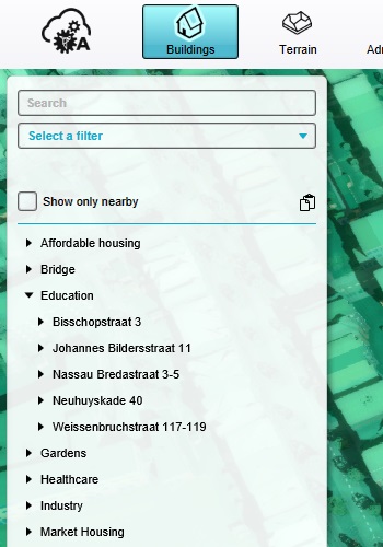 Buildings have already been explored in a previous step, but are one of the most important types of data in any Project. Buildings are effectively all spatial features in any geographic extent. Among other things, all of the following are known as Buildings in the Tygron Platform: