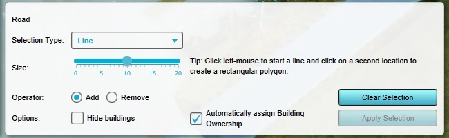 Because the Building which was drawn is a road, the "selection type" in the brush panel was automatically configured as a line. Although a broader explanation about using all the option in the brush panel is not part of this tutorial, it is worth noting that the precise default selection type may differ for different types of data, but that it is almost always possible to switch between selecton types.