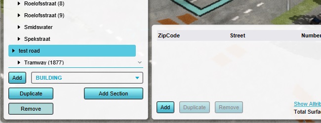 Data can also be added and removed entirely. In the left panel, ensure the "test road" building is selected. At the bottom of the left panel, click on "Remove".