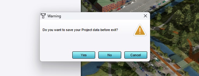 The application will now close. The client application always closes fully when exiting a Session. Additionally, because there are no more Users active in the Session, the Session itself is also ended on the server. Because the Project has been saved manually before closing it, the Project data will continue to exist on the server even after the Session has closed.