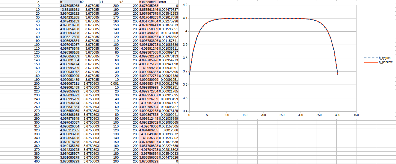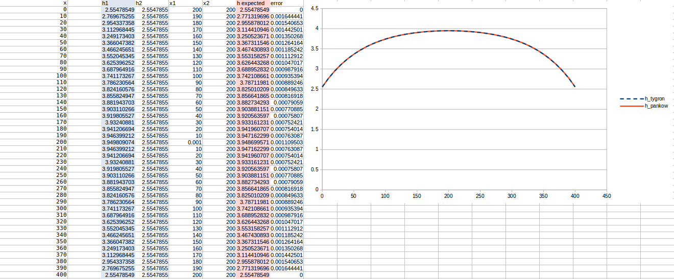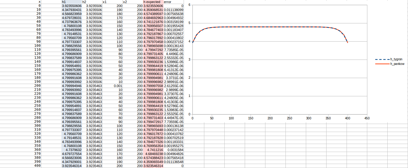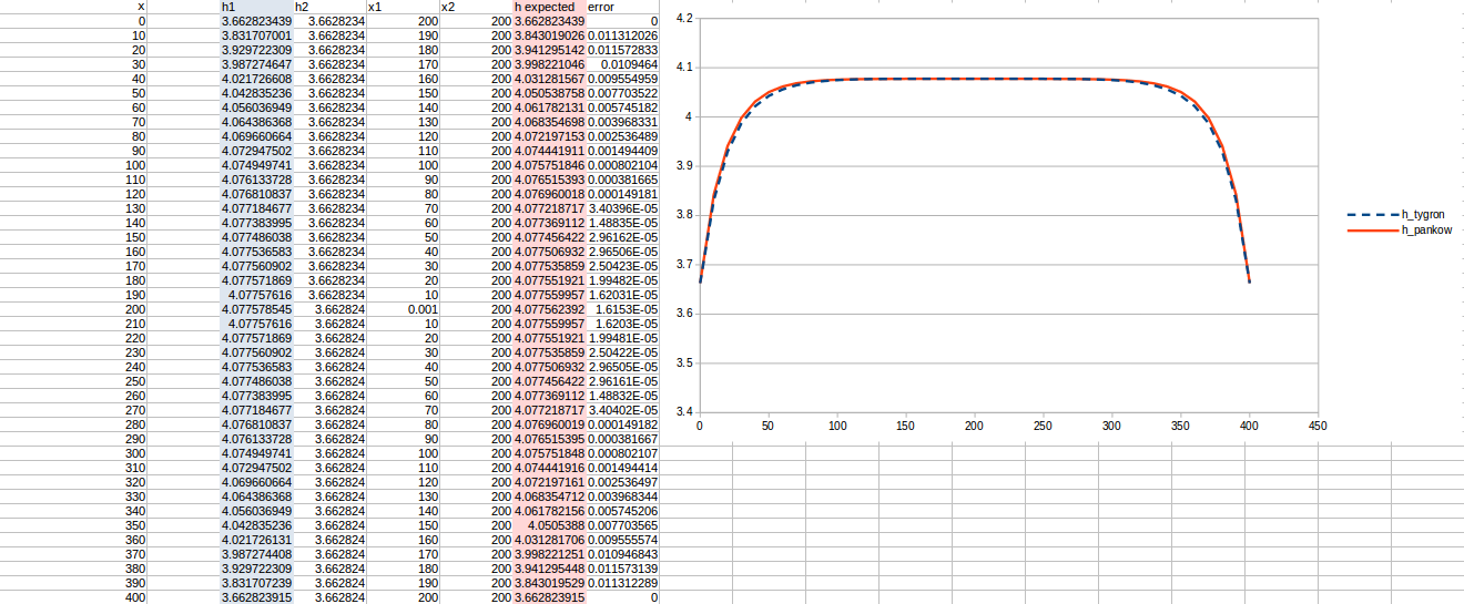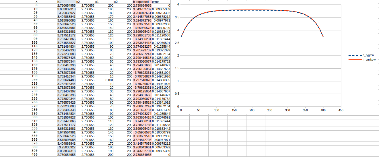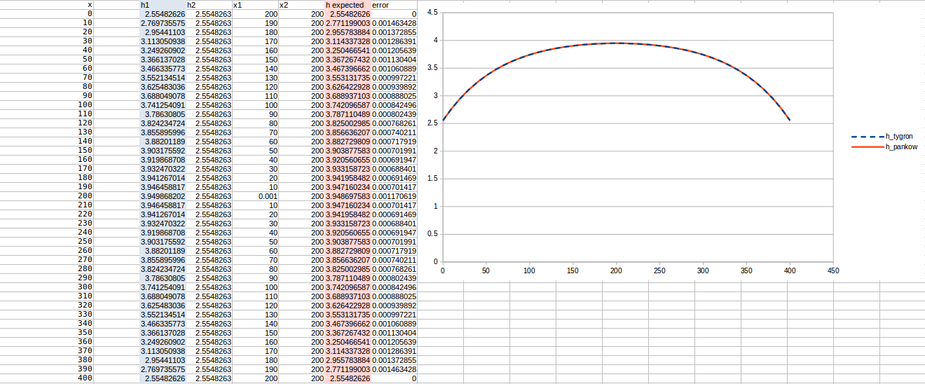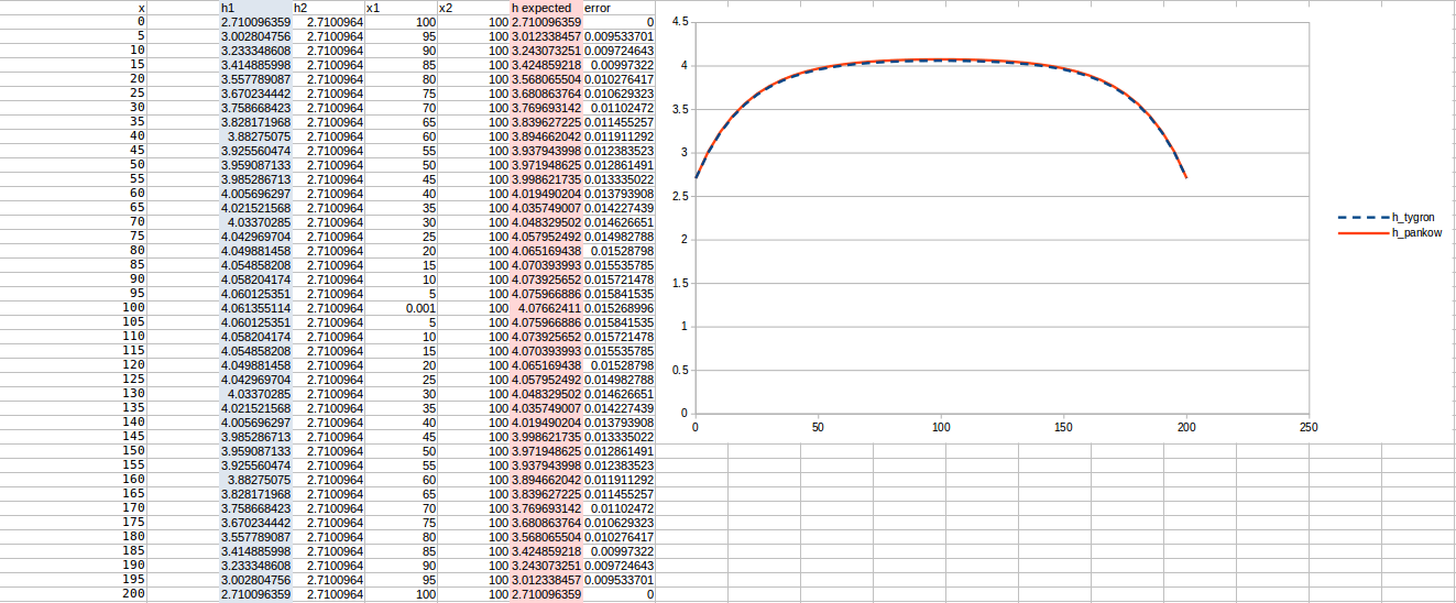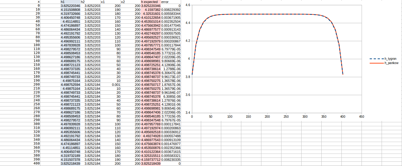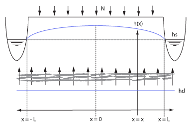 This benchmark demonstrates a situation where a parcel of land is situated between two waterways with a stable water level. In combination with ground water flowing from deeper ground layers through the bottom boundary, a characteristic curve will form over time, as shown in the image below. It is described in a water balance research in 1968 of Pankow and Rijtema [1], and also contains the accompanying formulas that describe the curve. In this case, we use the case which does not take into account the additional water flow resistance of the waterway. Secondly, rain could also be taken into account, but we set that to 0 to exclusively benchmark the bottom flow mechanics. The continuous rainfall case is already tested in freatic groundwater levels benchmark.