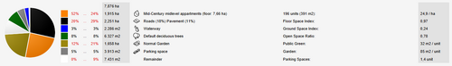 - In the last darker grey column, for the Buildig function the units/hectare are shown. Also the density indicators: Floor Space Index, Ground Space Index and Open Space Ratio are calculated. For the public green and garden functions the area per function/ unit is calculated. For the parking function, the amount of parking spaces per units are calculated. The size of a parking space can be adjusted in the Road tab