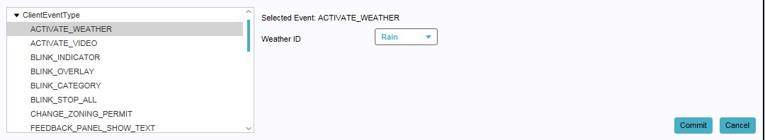 Selecting an event on the right panel also opens up the bottom panel where the actual event type can be selected. This selection can then be confirmed on the bottom panel by using the 'Commit' button. The 'Cancel' button clears the selection on the bottom panel.