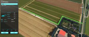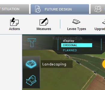 Switch to the "Future design" tab, and then in the viewer interface the Action Menu will appear. Open the menu with "Landscaping" options, and select the "Levee" action. You are now able to draw a line which will be the site of a new levee. Draw one or more lines in a protective formation near one of the farms which is affected by the flood. When you have made the selection, select "Ok". This will create a new levee, which will block water flowing across the land.
