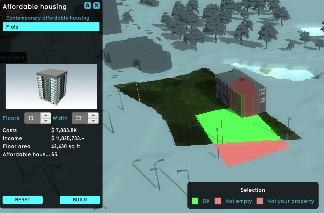 This part of the project area has been selected, but is not a valid selection. When taking the action for which this selection is made, this part of the 3D Visualization will remain unaffected. Other effects of the selection, such as the calculation of a price for the action, are unaffected by invalid parts of the selection. That is to say the price of a building will not increase when an invalid selection is added to the current selection.