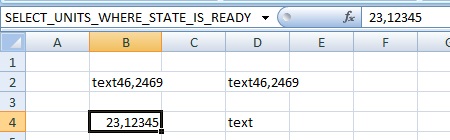 In this image the cell B4 is named "SELECT_UNITS_WHERE_STATE_IS_READY". This serves as an input cell. It has a value, which will be overwritten by the Tygron Platform.