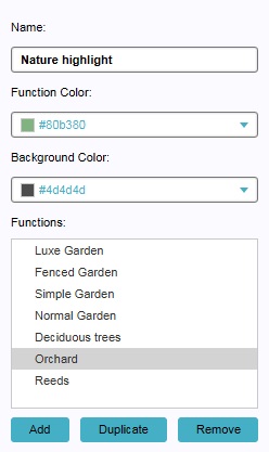 - The colors of the overlay. The "Function Color" is the color used to indicate the buildings with the specified functions in the 3D Visualization. The "Background Color" is the color used to color all other areas. You can change this selecting the color field. A panel will appear in which you can specify the desired color.