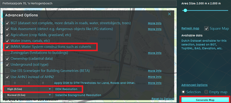 - Here you can check datasets that are used to generate the project. By default, the IMWA data source is checked where culverts are automatically imported from (if they are available for your location as open data). If you have your own culvert dataset, you can uncheck the IMWA data source. Also note the DEM resolution. Select a high DEM resolution to use the most accurate AHN data.