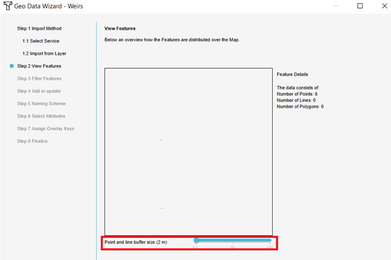- Follow the steps in the Geo Data Wizard to import weirs. Take note of the the type of data you want to import. If the weirs are points, they should be buffered to create polygons. Choose a suitable name for the weirs to recognize them later on. In step 7 choose the names of the requested attributes that are used to calculate with.