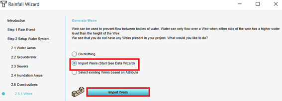 - Choose in step 2.5.1 weirs for the option to import weirs and then click on the button Import weirs.