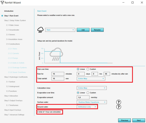 - In the first step of the wizard fill in the amount and the duration of the rain. Also fill in the simulation time.