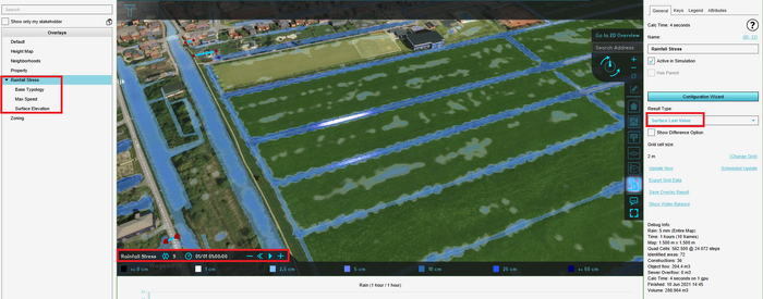 - Finish the wizard. The Rainfall will now be calculated. When the calculation is finished, see the result types in the left panel. In the right panel, more information can be found per result type. Click on the Play button to play the rainfall simulation.