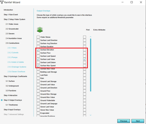 - In step 5 select the result type maps you would like to see in your project. Useful result types are Surface elevation,Surface last value, Surface max speed and Base types.