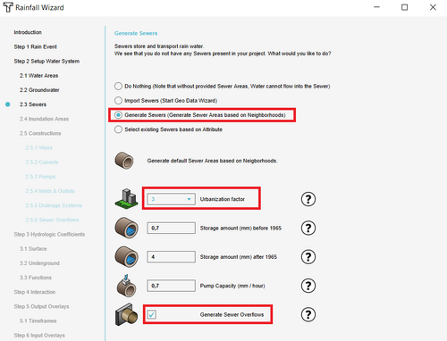 - In step 2.3 choose for the option to import your own Sewer area data or choose to Generate Sewers. Based on the Urbanization factor, sewer areas can be automatically generated for your project area.