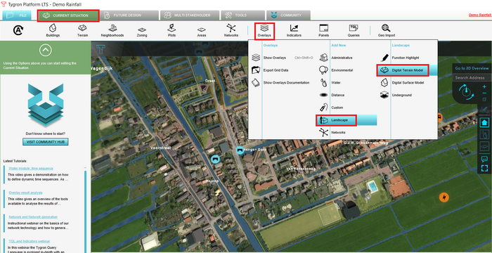 - In the left panel, select the Rainfall Overlay and click in the right panel on the Configuration wizard. In the following steps this Water Overlay Wizard will be completed to import the water system and configure settings for the Rainfall scenario.