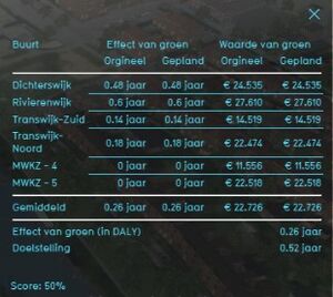 The score is based on the amount of DALY( disability-adjusted life years) realized in the project area due to present green spaces. The additional life years are also assumed to have a monetary value due to avoided healthcare costs. The effect of green on the health of the citizens in the project area is visible as the score of the indicator. For each neighborhood the effect of green on the health of the citizens in that neighborhood is determined and an average of all results is calculated for the final score.
