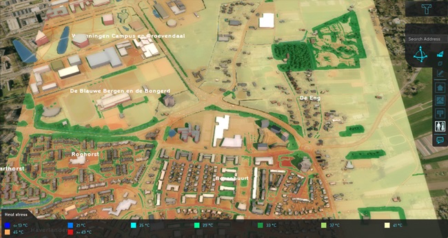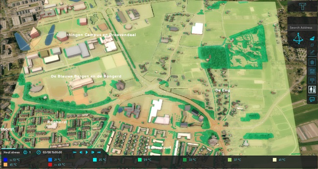 The Heat Overlay will show results, based on a default date and time, and its weather measurements. These defaults are based on the benchmark the RIVM has run, i.e. august 2nd, 2013, with weather station measurements from the Wageningen environment.