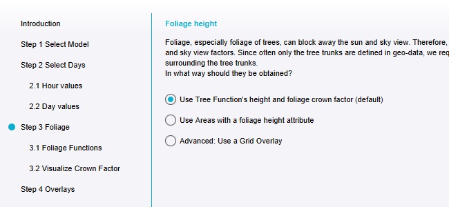 - The benefit of this approach is that it can be derived from data which is already almost always available in a Project. In addition, the calculation will also be immediately responsive to changes in the Buildings data, for example when testing Measures or other Future Designs. It has the downside that the computed foliage has a consistent and assumedly circular shape.