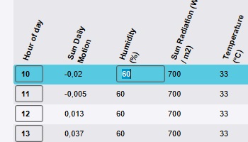For every hour, specific weather measurement data can be configured to represent the changing weather conditions over the day.