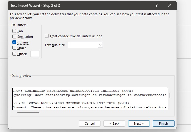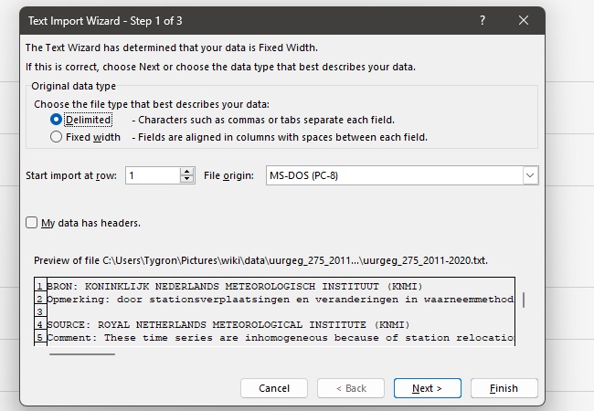 Select the .txt file downloaded, and opt to open it. This will open the "text import wizard".