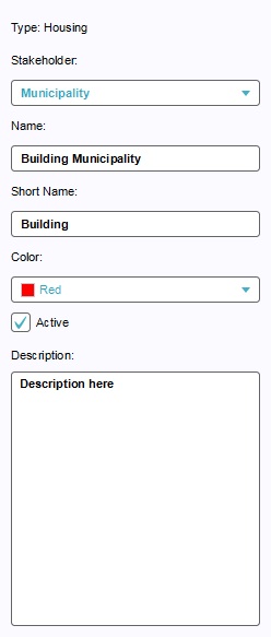 The housing indicator indicates a target of a stakeholder to realize specific amounts of a certain type of building, in excess of the starting situation. For example, when a session starts with 150 houses, and the housing indicator has a target for 50 houses, a total of 200 houses must exist in the project area for the indicator to score 100%.