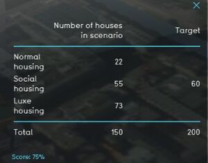 The indicator panel shows the three different types of housing, the number of houses that are built in the neighborhood and the targets for the social housing and the total target.