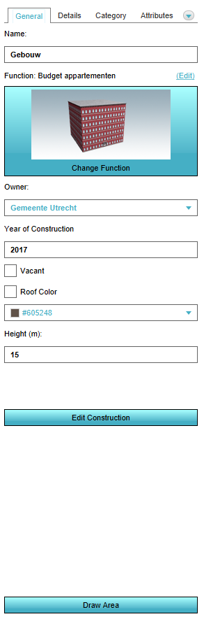 The Tygron Platform uses the actual year of construction for most buildings when a project is based on real data. In case a new building is added, or no date is available, it is possible to enter a year by hand in this field. In case no value is entered on a new building that is added to a project, the current simulation year is used.