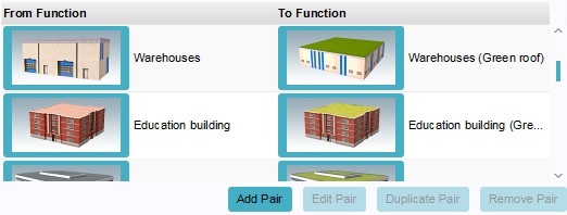 When a user wishes to upgrade a building, the building's function must be the starting function of a function pair defined for the upgrade. The resulting function will be the target function of the same function pair. It is possible to have the target function be the same as the starting function of the same pair, or of another pair, allowing for consecutive or cyclic upgrades.