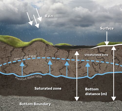 Water can flow further down into the saturated zone at a speed defined by the ground terrain's GROUND_INFILTRATION_MD attribute. Based on the given timestep and infiltration speed, the distance the water can travel downwards is determined. This distance can be projected on this unsaturated zone as a subsection. The amount of water that flows from the unsaturated zone to the saturated zone is then equal to the amount of water in this subsection. After water has been added to the saturated zone, the groundwater level (and thus the height of the saturated zone) is redetermined. The water remaining in the unsaturated zone is redistributed uniformly across the (remaining) unsaturated zone.
