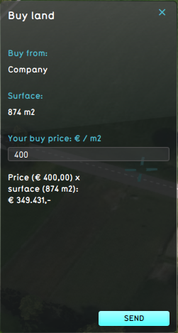 Panel that opens once a selection has been made for the Buy land Special Option. This panel allows the buying Stakeholder to adjust the price per square meter for which the Stakeholder would like to buy the land.