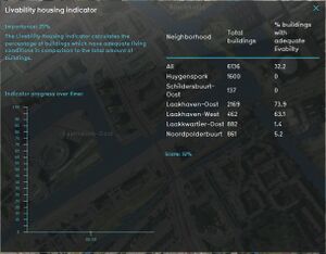 The Livability Housing indicator calculates the percentage of buildings which have adequate living conditions in comparison to the total amount of buildings. See the Livability (Overlay) for the livability scoring. The indicator panel shows these percentages per neighborhood. This indicator is useful for projects where for example: