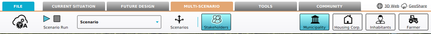 The Multi Scenario tab is the third of the four ribbon tabs and is located in the top part of the editor. The Multi Scenario tab contains the options to design multi-scenario analyses. This consists of managing stakeholders and configuring scenarios.