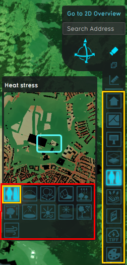 Overlays available to stakeholders appear as buttons on the right side of the interface. Clicking on any of these buttons will switch the view to the specific overlay. Clicking on the "City" overlay will switch the view back to default. Some overlays are automatically added when a project is created. Some overlays are closely related to indicators, such as Heatstress and Livability.