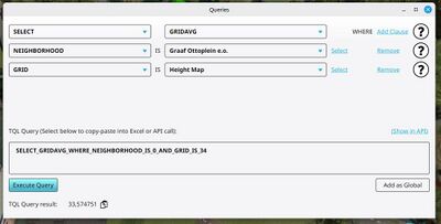 A project in the Tygron Platform can use multiple geospatial data sources. To retrieve all sorts of data that are present, but for which no dedicated data structure (predefined indicators) already exists, the TQL (Tygron Query Language) has been developed. By using queries with the below structure, dedicated data requests can be sent to the Tygron Platform, from which the results can then be calculated in, for instance, an Excel Indicator.