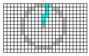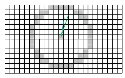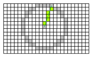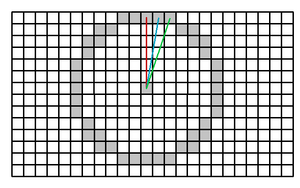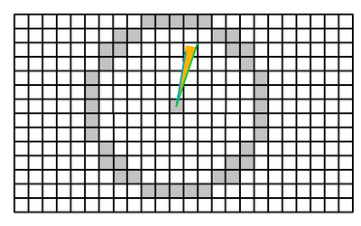 The area of a sky view section is calculated as followed: First the top down view is considered. To determinee the amount of rays that will be cast, the following scheme is applied: A unique ray is cast for each gray cell. Each gray cell also functions as a unique ray end point. The colored cells indicate the cells visited for a particular ray. Each cell has a height of a building, terrain or foliage. The maximum search range is currently 100 meters.