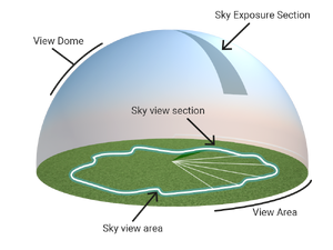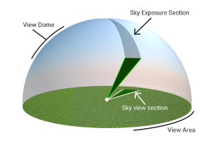 In literature, two sky parameters are mentioned which is sometimes confusing; Sky exposure and sky view factor. The sky exposure is related to the sky view dome (3D). The sky view factor is related to the projection of the view dome to the horizontal plane (2D).