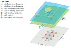In the model, imbalances in the water surface elevation across the grid drive the flow of water until a state of equilibrium is reached in terms of h and flux. Behavior of the flow is described by a second-order semi-discrete central-upwind scheme produced by Kurganov and Petrova (2007)[2], which is based on the 2-D Saint-Venant equations (a.k.a. shallow water equations):
