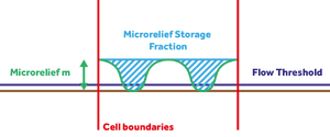 For water to flow from a cell to its neighbors, the height of a water column needs to be at least 0.5mm. We call this the minimum flow threshold. However, if microrelief is defined, this minimum flow threshold of a cell is potentially raised to the amount specified for microrelief. Microrelief can be specified by a function's microrelief or terrain's microrelief, or using a grid overlay for the Microrelief prequel. Furthermore an optional Microrelief storage fraction can be set, which will be applied to the microrelief threshold.