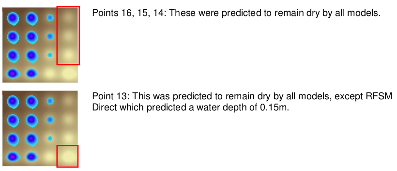 • Final timeframe of water levels as generated by the Tygron Platform (left) and by the other packages (right).