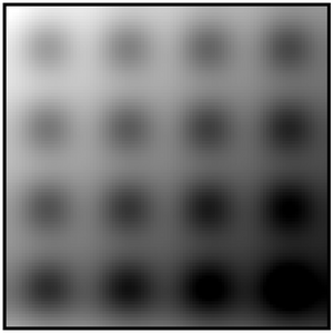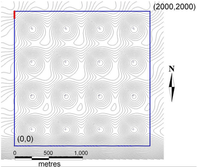 The area modelled, shown in Fig. (a), is a perfect 2,000 m x 2,000 m square and consists of a 4 x 4 matrix of ~0.5-m deep depressions with smooth topographic transitions. The DEM (digital elevation model) was obtained by multiplying sinusoids in the north to south and west to east directions, and the resulting depressions are all identical in shape. An underlying average slope of 1:1,500 exists in the north to south direction, and of 1:3,000 in the west to east direction, with a ~2-m drop in elevation along the north-west to south-east diagonal.[1]