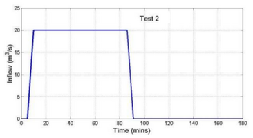 The inflow boundary condition was applied along a 100-m line running south from the northwestern corner of the modelled domain, indicated by a red line in Fig. (a). A flooding with a peak flow of 20 m3/s and time base of ~85 minutes was implemented according the hydrograph in Fig. (b). The model was run for 2 days (48 hours) to allow the inundation to settle to its final state.[1]