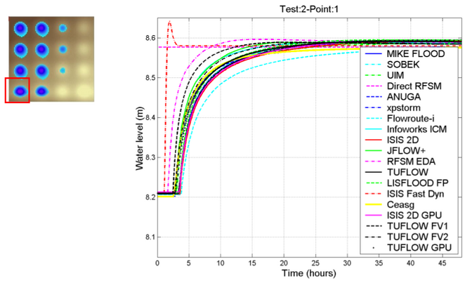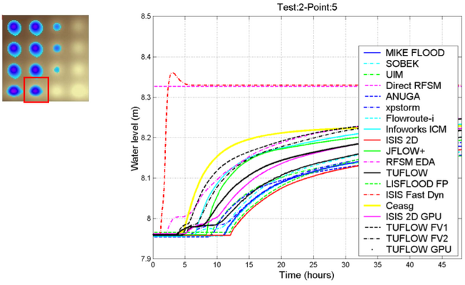 The test has been designed to evaluate the capability of a package to determine inundation extent and final flood depth, in a case involving low momentum flow over a complex topography.[1]