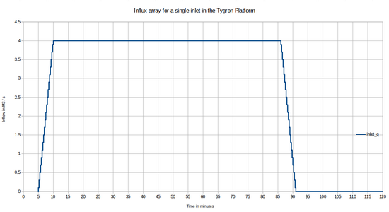 In order to regulate the water level according to the water-level graph, the following setup was used: Inlet objects were placed on single grid cells with a constant value for x = 1 and y varying from 1 to 5, yielding a total of 5 points. The inlets were configured as follows: